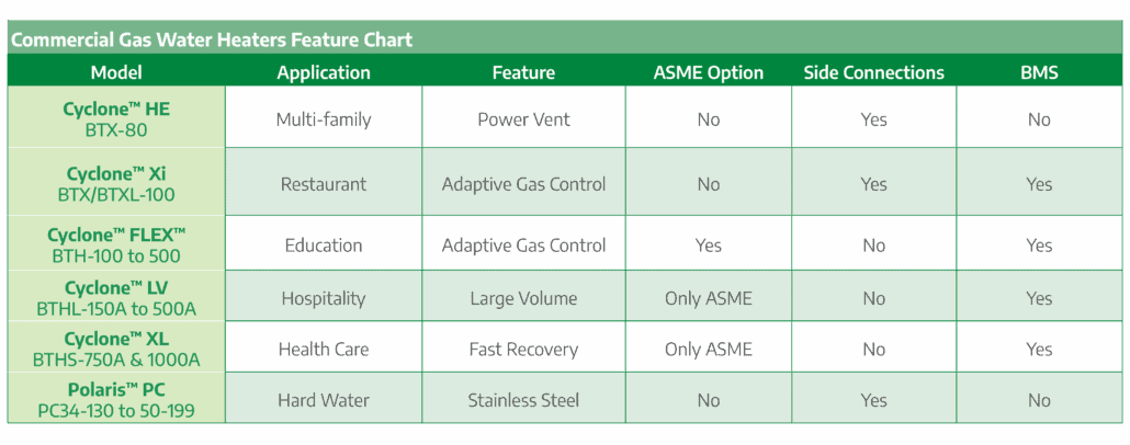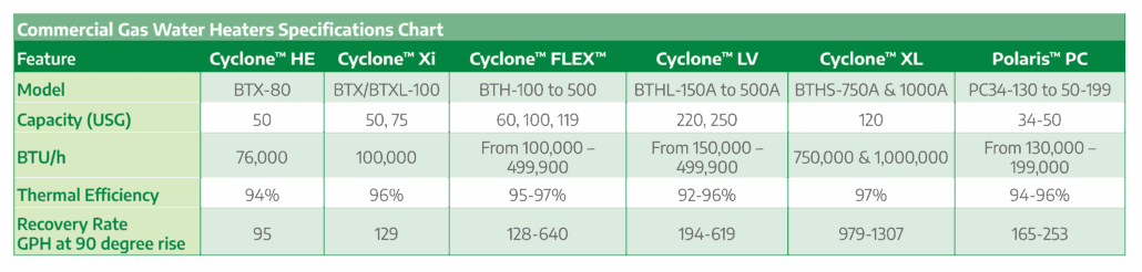 The A. O. Smith Cyclone™ FLEX™ family of condensing water heaters are designed to deliver years of dependable service while providing optimal efficiency. The FLEX™ enhancements represent the latest in water heating and gas combustion technology. Models are now available from 100,000 to 500,000 Btu/h and all deliver thermal efficiencies of 95% or greater. The time proven and unique helical coil heat exchanger makes Cyclone™ the clear choice for demanding commercial applications.